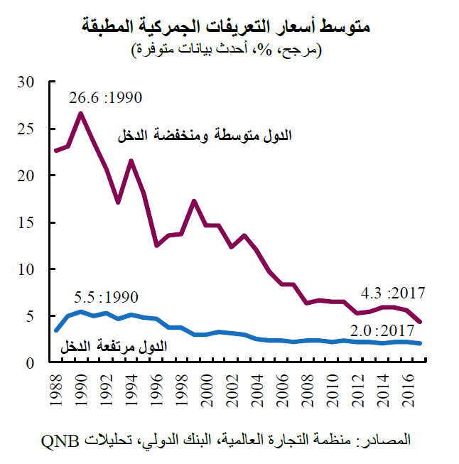 فيما يتعلق بتحرير التجارة، هناك الآن مجال محدود لإجراء تخفيضات إضافية في التعريفات الجمركية. في حين كان تخفيض التعريفات محركاً مهماً لنمو التجارة في الماضي، لا سيما من خلال دمج الدول متوسطة ومنخفضة الدخل في الاقتصاد العالمي، فإن متوسط معدل التعريفات المطبقة حالياً منخفض في كل من الاقتصادات المتقدمة والأسواق الناشئة. بالإضافة إلى ذلك، لا توجد رغبة سياسية كبيرة في إجراء مزيد من التخفيض للتعريفات التي تعتبر منخفضة حالياً، فذلك سيؤثر في الغالب على القطاعات الحساسة، مثل القطاعات المتعلقة بالزراعة والأمن القومي.