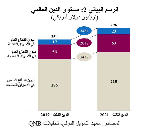 أدى تفشي الجائحة حول العالم إلى أكبر زيادة في الديون منذ الحرب العالمية الثانية. في الواقع، أشار معهد التمويل الدولي (IIF) إلى أن الدين العالمي ارتفع بنسبة 16% إلى 296 تريليون دولار أمريكي بين الربع الثالث من عام 2019 والربع الثالث من عام 2021 (الرسم البياني 1)، متجاوزاً 350% من الناتج الإجمالي العالمي. وأدى الدعم النقدي والمالي غير المسبوق إلى زيادة العرض والطلب على الدين، في ظل تعرض العالم لأزمة صحية عالمية وركود اقتصادي عميق. وكانت مستويات الدين مرتفعة بالفعل قبل الجائحة، لكن يتعين على صانعي السياسات الآن أن يتعاملوا مع عالم يتسم بارتفاع قياسي في مستويات الدين العام والخاص، وظهور طفرات جديدة من الفيروس، وتصاعد التضخم.