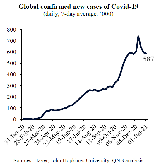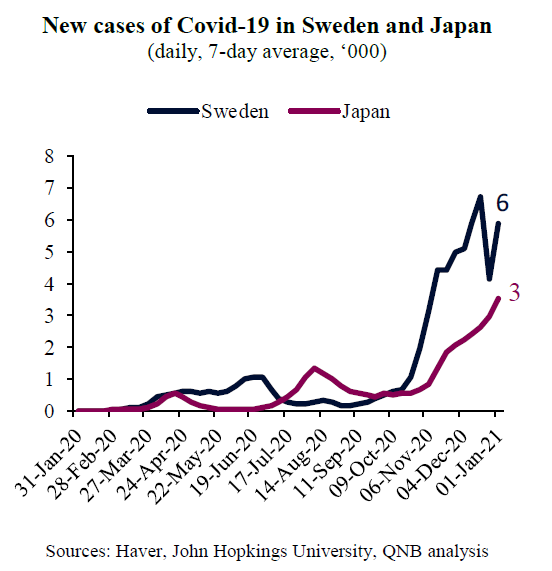 All in all, Covid-19 is still far from being under control. Even in advanced economies that initially succeded in controlling the virus, such as Japan and Sweden, new cases are surging. Although the numbers of cases are growing significantly in Japan and Sweden, the overall number is still low in comparison with countries with more severe epidemics. Similarly, countries that brought the virus under control should not be complacent, as preventive measures should continue to be in place until mass immunization is reached. A failure in virus containment may produce virus mutations that are more difficult to manage. More contagious strains of Covid-19, such as the one that is dominating new cases in the UK and spreading in South Africa, can produce more acute epidemics and provide a bigger base for further mutations.