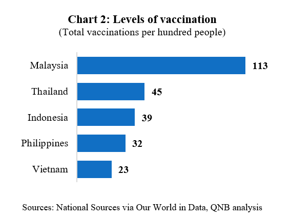 Third, thanks to progress with vaccination and stable or falling case numbers, some governments are now beginning to reduce lockdown restrictions and reopen their economies. Malaysia has started a cautious rollback of restrictions and Indonesia has begun to reopen malls, restaurants and mosques in the past few weeks. Following Singapore, Thailand is shifting its approach towards “learning to live with the virus”, with plans to ease restrictions during September and open the whole country to vaccinated tourists from October. However, there is a risk that restrictions may need to be re-imposed in the future in some countries that still have a low level of vaccination.