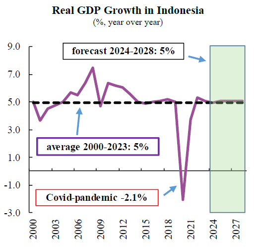 In recent decades, Southeast Asia has emerged as one of the most dynamic regions in the world, featuring some of the fastest-growing economies. This group of countries includes Indonesia, the fourth most populous country in the world. During 2000-2023, the average growth rate for the South-Asian economy was 5%. This is a remarkable performance, sustained during a challenging period that included the highly volatile years of the Global Financial Crisis, the European Sovereign Debt Crisis, and the Covid-pandemic. Furthermore, this was achieved with notable stability, with only three years of growth below 4%.