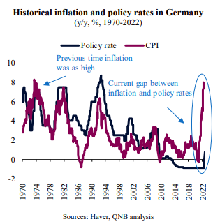 First, inflation is not only well above the 2% target for the Euro area, but longer-term inflation expectations are de-anchoring rapidly. According to a flagship poll from the Zentrum für Europäische Wirtschaftsforschung, Leibniz Center for European Economic Research (ZEW) Institute in Mannheim, Germany, Euro area inflation expectations are around 4.5% in 2023 and 3% in 2024. This is already by far the most severe inflationary shock the Euro area has ever experienced in its more than 23 years of history. Taking Germany as a proxy for inflation during the pre-Euro era, last time inflation reached rates that were similar to August 2022 highs was in mid-1973. However, at this time the Bundesbank policy rate was at a similar level than inflation. This time, the spread between inflation and policy rates is so wide that the ECB has still a lot more “catch up” to do in terms of rate hikes.